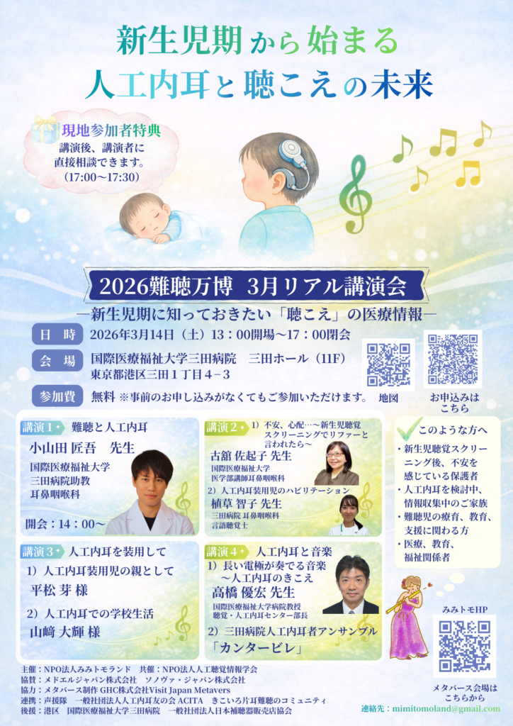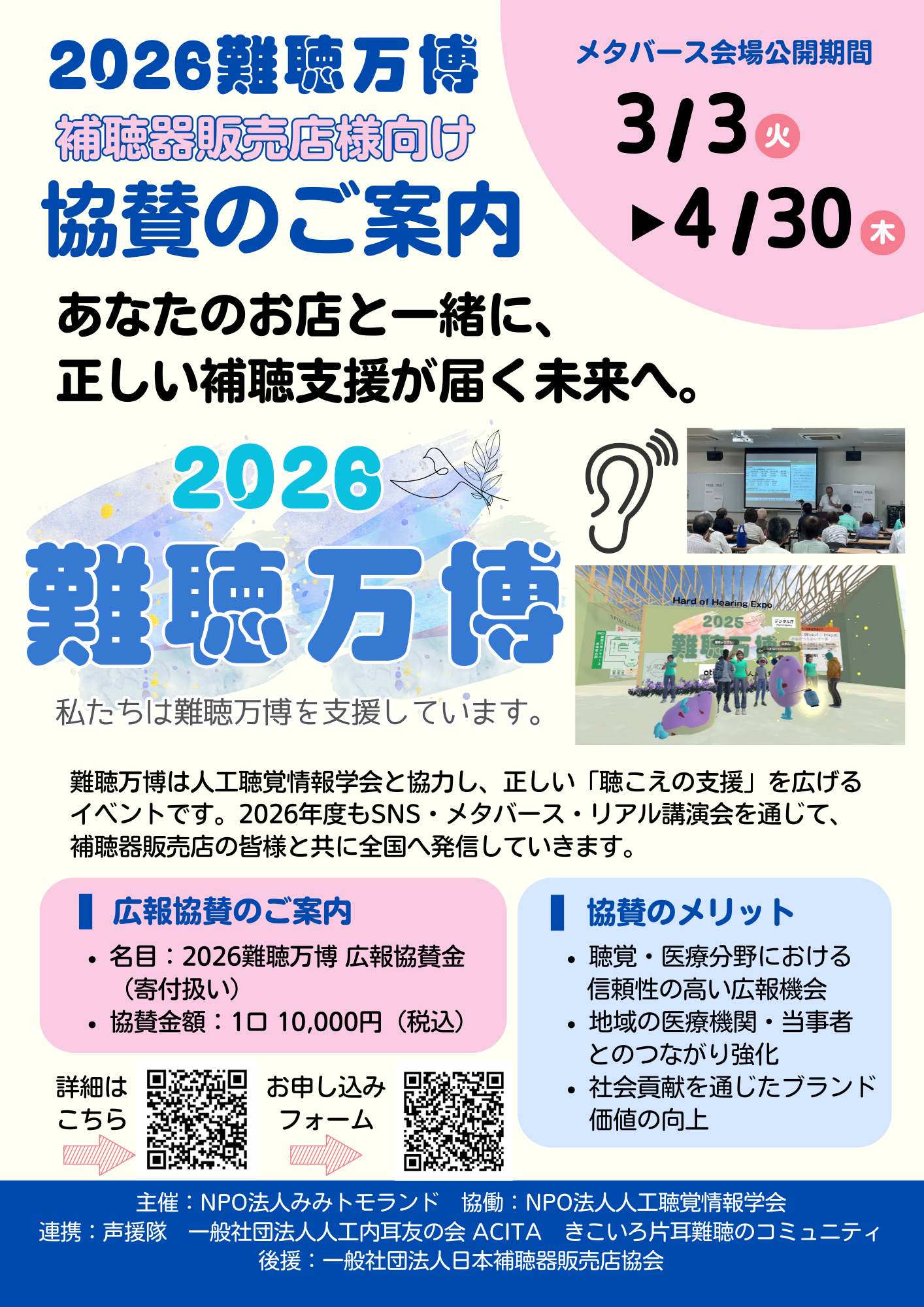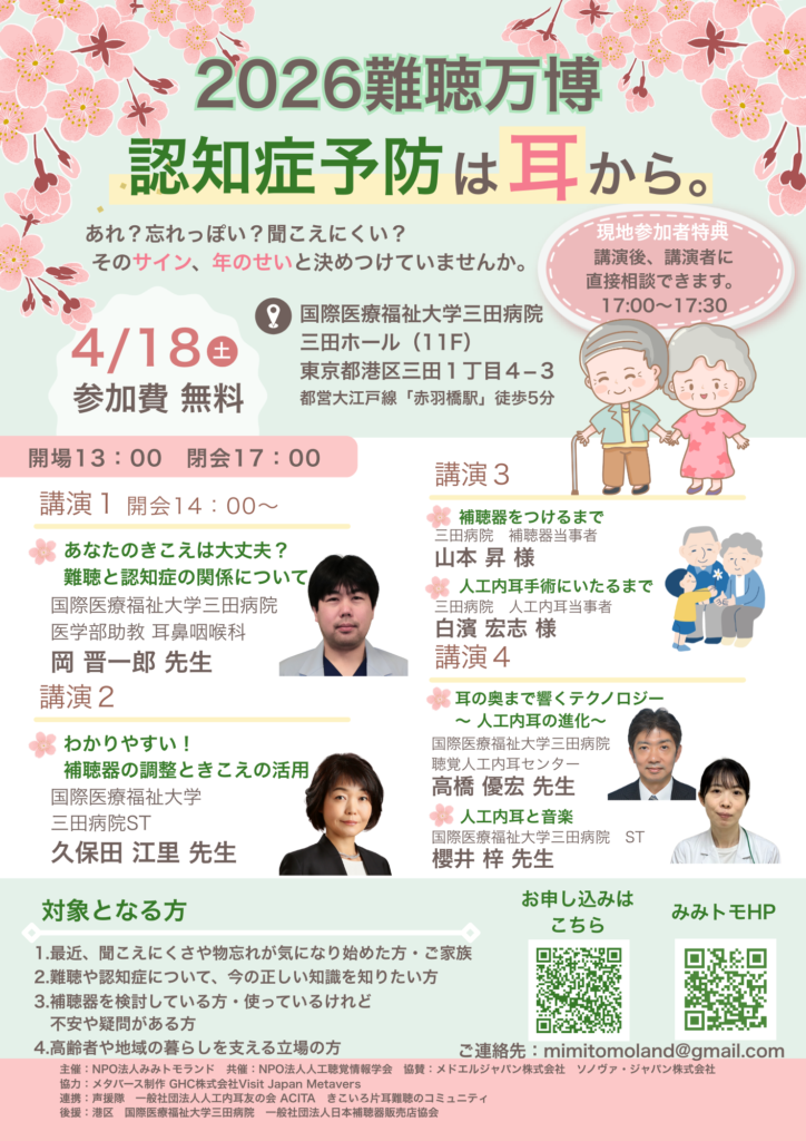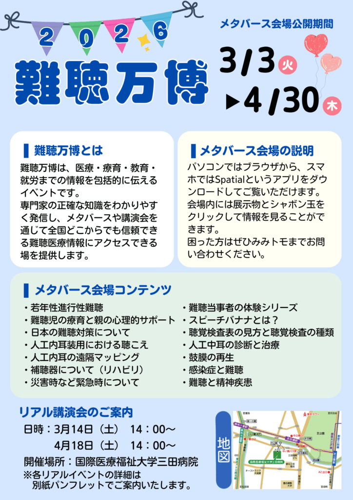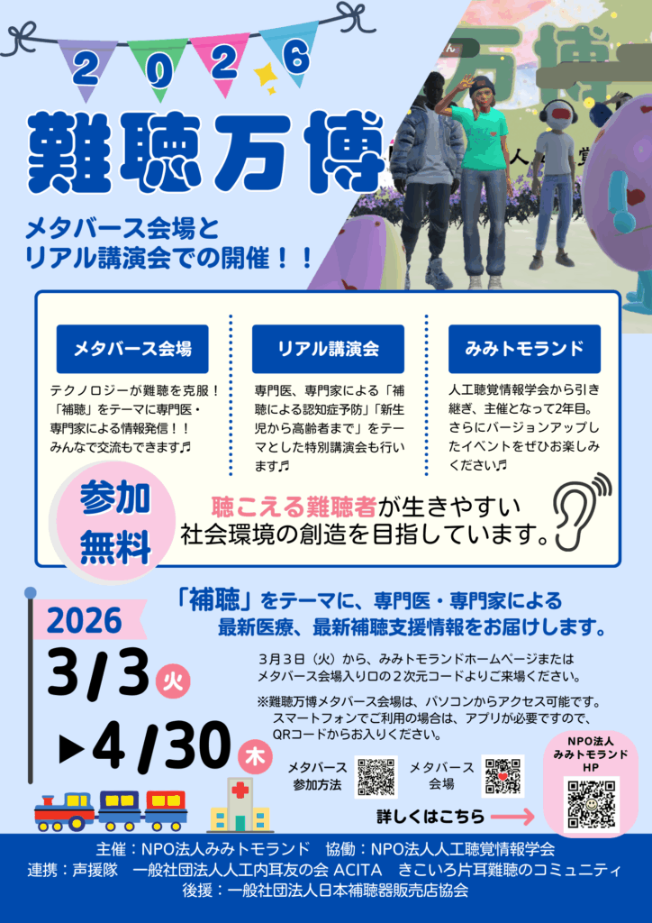 難聴当事者やそのご家族など、正しい最新の難聴医療情報と補聴支援にたどり着くことができるように、2026年度も難聴万博を開催致します。